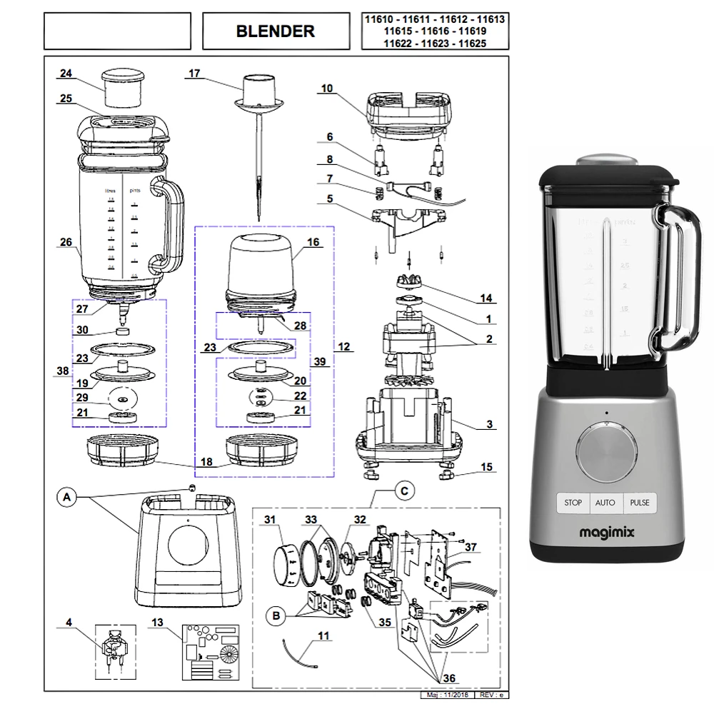 | Désignation | 39- Ens. couteau Blender moulin épice, Corps+protège led chromé mat, Mini bol complet, (1) Protection moteur, (2) Moteur + caoutchouc, (3) Socle, (4) Cable d'alimentation, (5) Protection sécurité, (6) Broche sécurité, (7) Ressort sécurité, (8) Microswitch sécurité, (10) Support cuve, (11) Led, (C) Bouton commande complet, (13) PCB alimentation, (14) Entraînement caoutchouc, (15) Pieds x 4, (16) Cuve moulin épices, (17) Spatule, (18) Ecrou verrouillage couteau, (19) Support couteau blender, (20) Support couteau moulin, (21) Entrainement metal couteau, (22) Jeu bague lame moulin, (23) Joint cuve blender, (24) Bouchon doseur, (25) Couvercle, (26) Cuve blender, (27) Couteau blender, (28) Lame moulin épice, (29) Jeu bague lame blender, (30) Joint couteau, (31) Bouton commande, (32) Came de commande, (33) Support bouton + joint, (34) Bouton O/O/P, (35) Ressort touche, (36) Support PCB + microswitch, (37) PCB commande, (38) Ensemble couteau Blender |